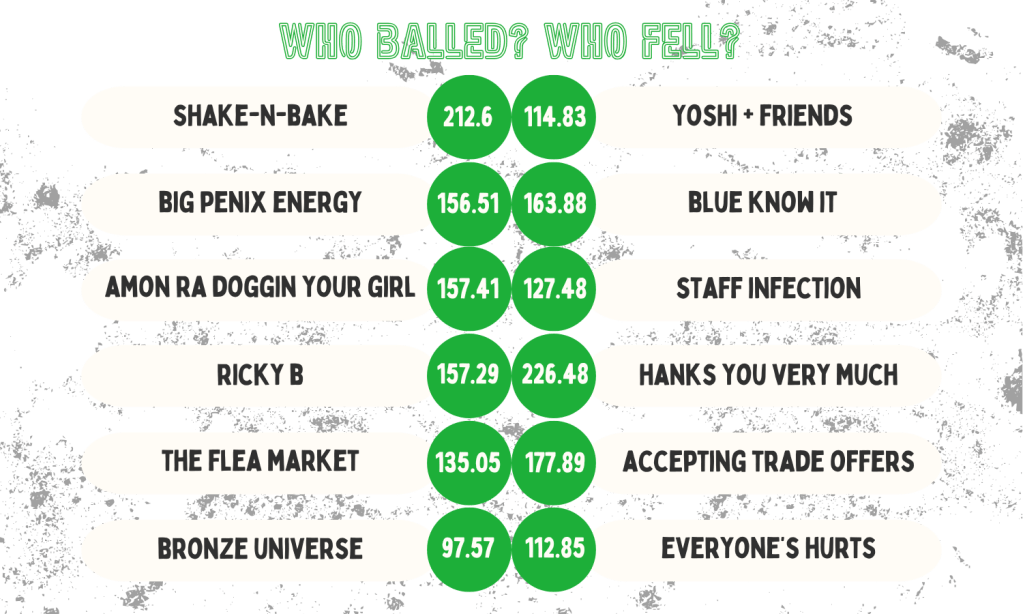 With Patrick Mahomes on BYE, Bronze Universe fell for the Geno trap. It’s the old 40 points one week, 7 points the next and it stung him hard as they dropped to a very depleted Everyone’s Hurts squad who left Jahmyr Gibbs (50!) on the bench! Wow, I didn’t notice that one until writing this, that really sucks for Bronze. BIG missed opportunity there. Especially with Jacoby Brissett (32) on the bench, RIP. Bronze ended the week as the lowest scoring team and their opponent was the 11th. It’ll hurt for a minute but they need to get ready for what should be an easy matchup in Ricky B in week 11. This can’t turn into a losing streak.