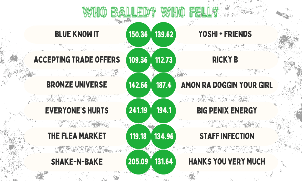 Trade Offers drops to 7-5 as Lamar Jackson fails to hit 10 points for the second week in a row. The do everything CMC (33) game on Monday came JUST short of delivering a victory! The team may also be without Tee Higgins moving forward as he went down with a head injury in the Bengals contest. The good news for ATO is that Bucky Irving should be on his way back and provide some much needed help during this playoff push. They’ll clash in a meaningful one against the 6-6 Blue Know It squad who is also in need of a win to keep their hopes alive.
